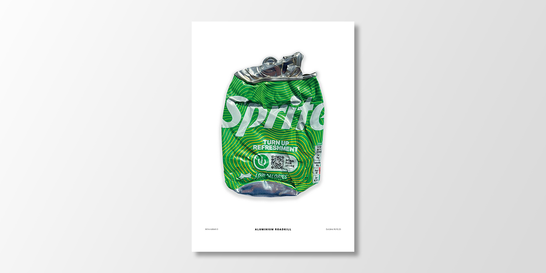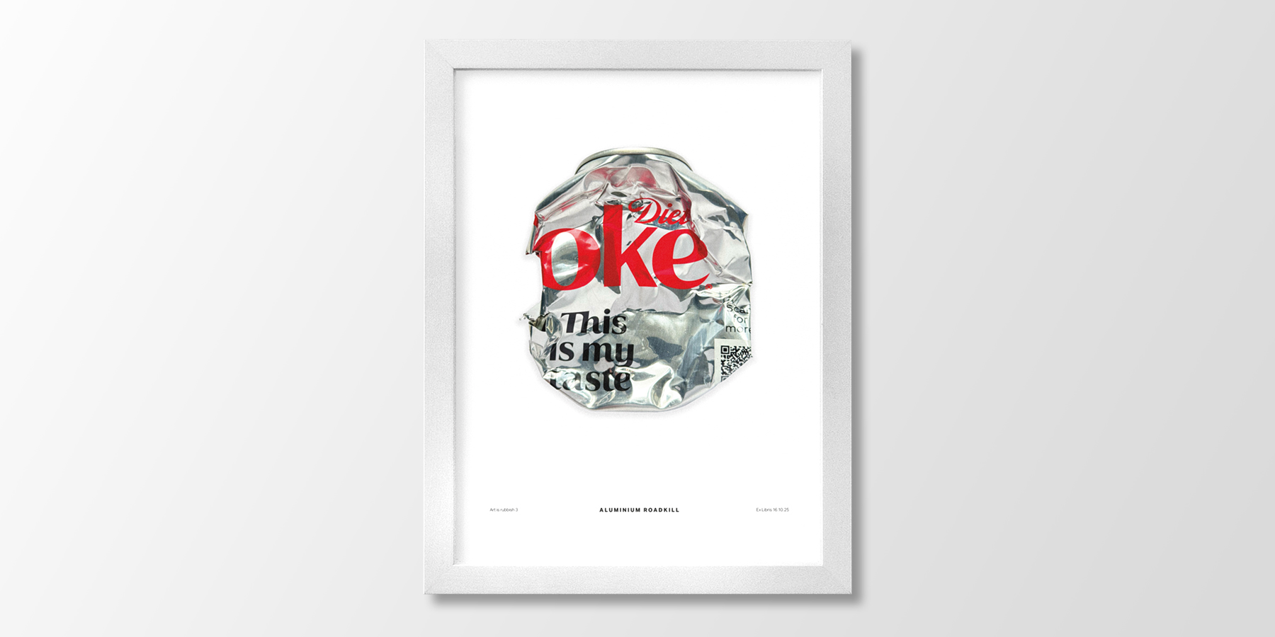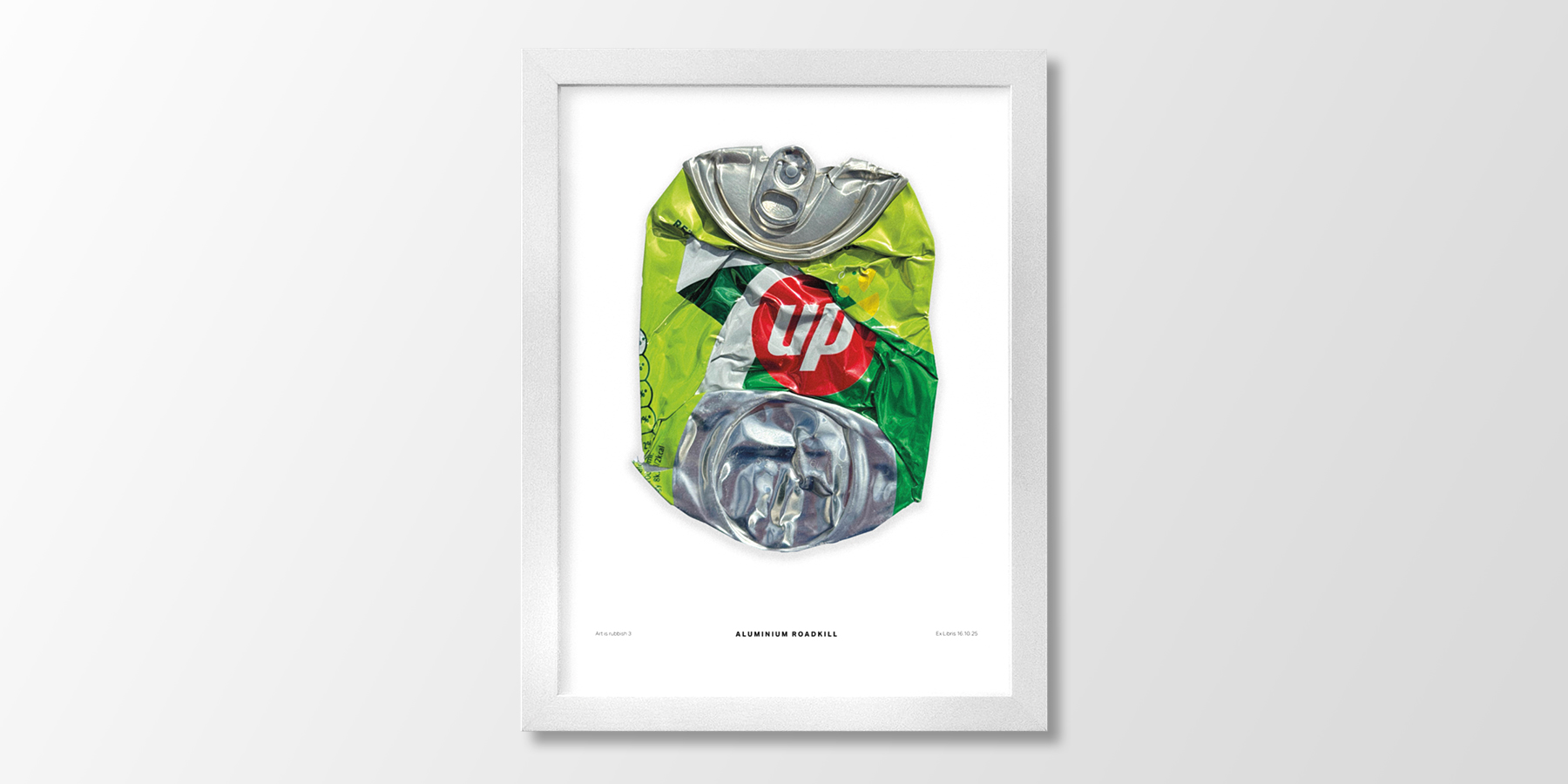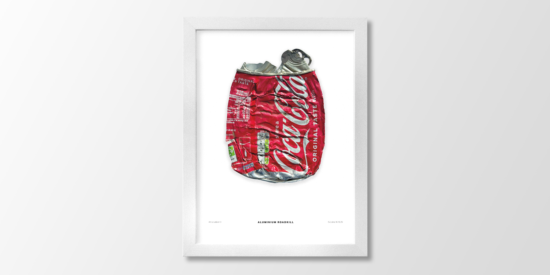 Approximately 3 billion aluminium drinks cans end up in landfill or are otherwise not recycled in the UK each year. If an aluminium can goes to landfill, it will sit there for 500 years before it oxidises. Ironically, aluminium is the most recyclable of all packaging materials. Recycling one aluminium can saves enough energy to run a TV for three hours. And the process takes 95% less energy than producing one from its raw materials. So here, I’m turning found aluminium cans into art. Displayed in their crushed and imperfect form. That’s half a dozen fewer cans heading to landfill.